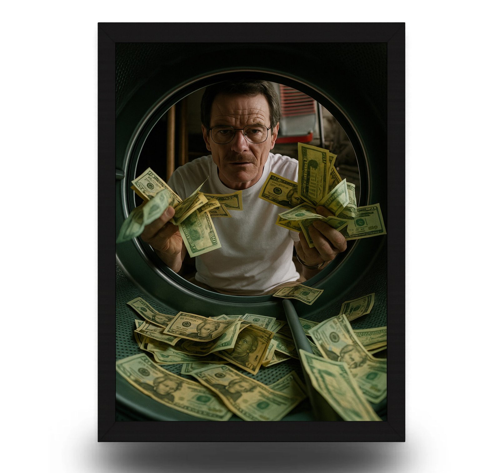 Bring the gritty essence of Breaking Bad to your walls with this powerful Walter White Money Laundering Poster Frame. Capturing the iconic moment of Heisenberg surrounded by cash, this frame is the perfect collectible for fans of the legendary TV series.