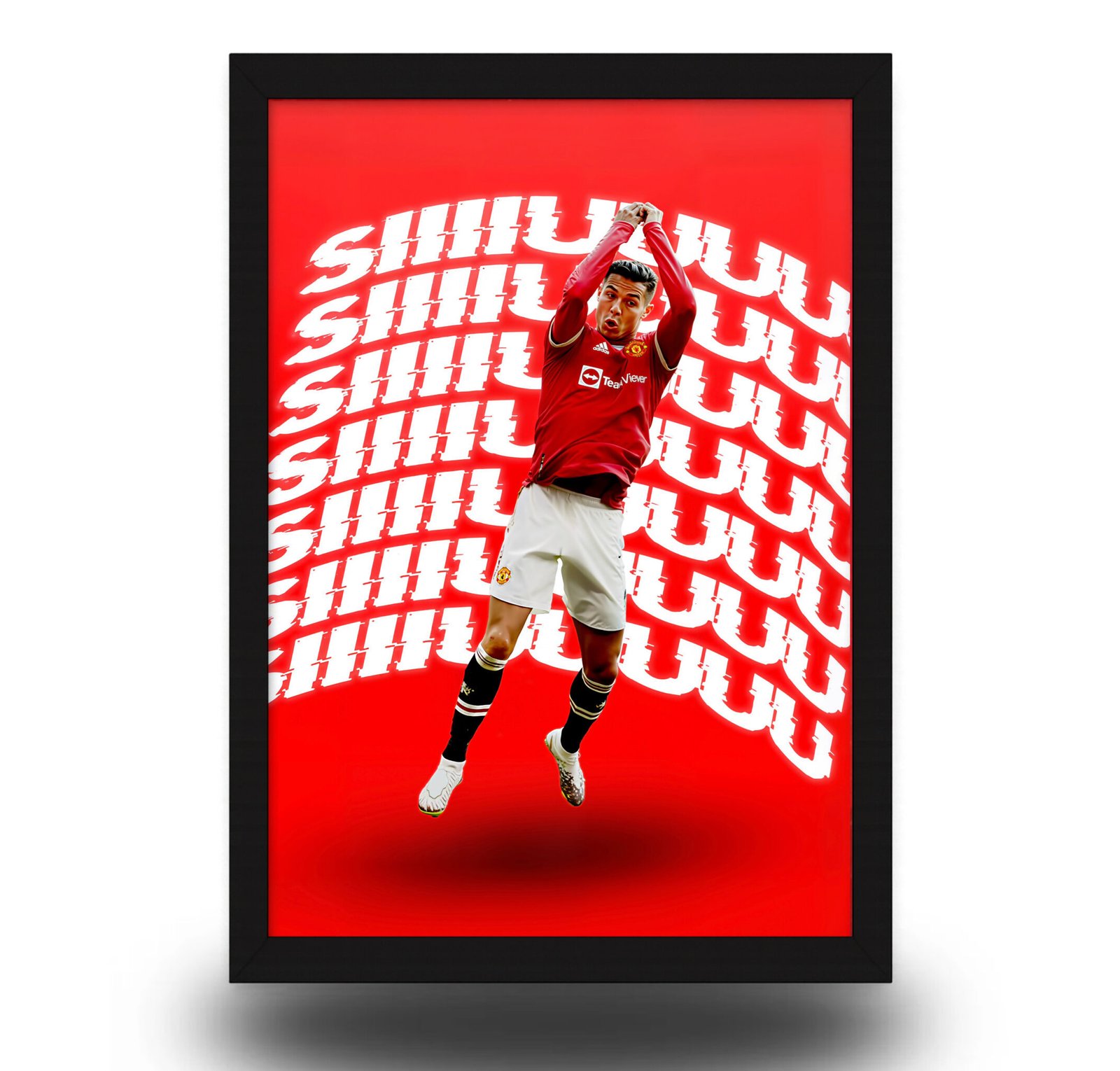Bring the energy of Old Trafford to your walls with this Cristiano Ronaldo “Siuuu” Celebration Poster Frame. Featuring CR7 in his iconic jump with a bold red background, this premium wall art is designed for true Manchester United and Ronaldo fans.
