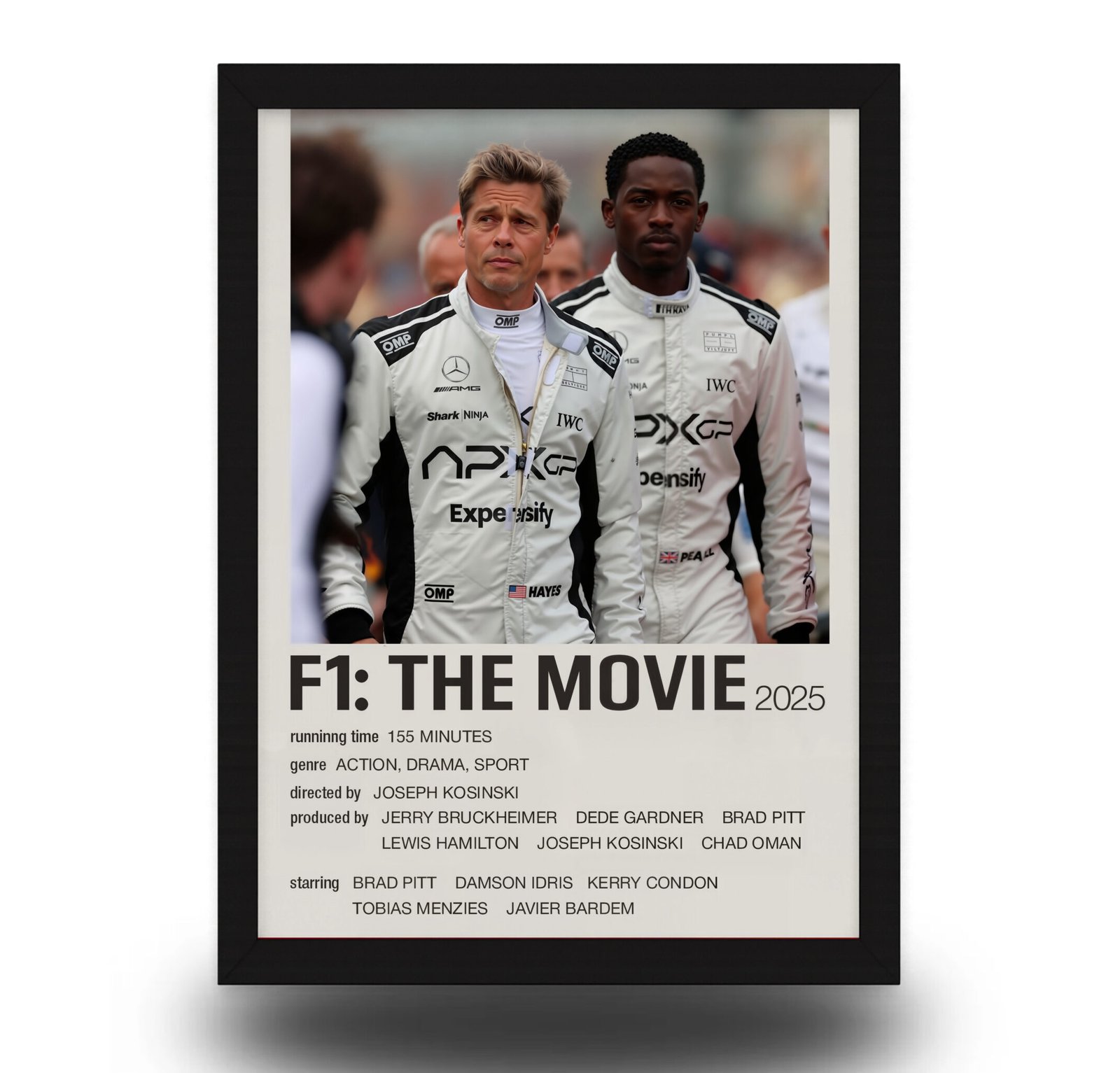 Brad Pitt aur Damson Idris ke lead roles ke sath upcoming F1 movie ka official-style poster – adrenaline, action aur motorsport ke fans ke liye ek exclusive collectible.