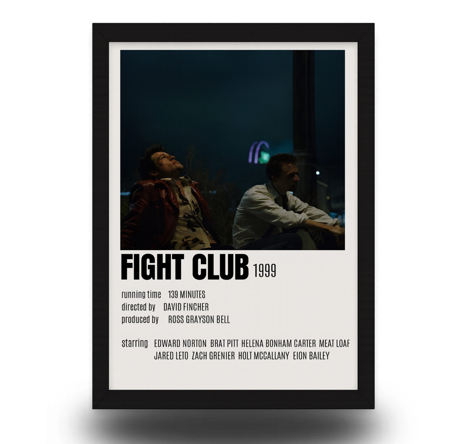 Capture the raw essence of Fight Club with this minimalist poster design. Featuring Brad Pitt and Edward Norton in an iconic night scene, paired with clean typography on a white layout, this framed art piece brings modern cinematic style to your walls. A must-have for movie lovers who appreciate drama, grit, and timeless design.