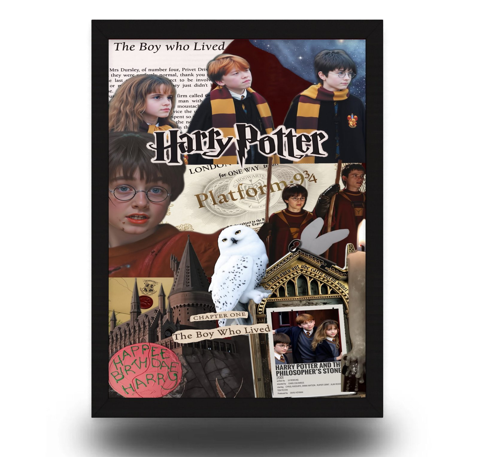 Step into the magical world of Hogwarts with this stunning Harry Potter collage artwork. Featuring Harry, Ron, Hermione, Hedwig, Platform 9¾, and iconic moments from The Philosopher’s Stone, this framed art is the perfect collectible for every Potterhead. A nostalgic piece that brings the magic of childhood back to life, ideal for decorating bedrooms, living spaces, or gifting to true fans of the Wizarding World