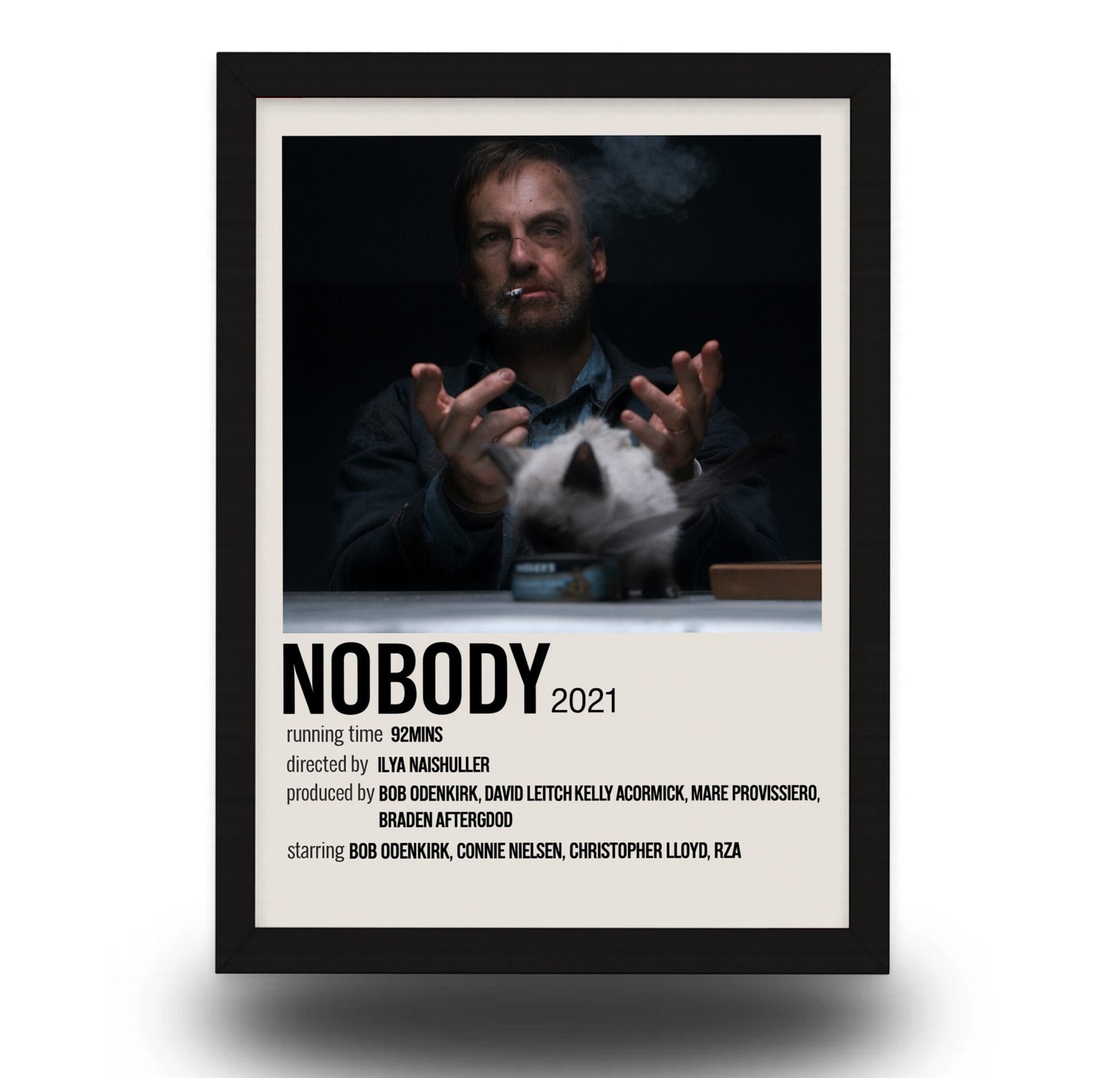 Framed wall art of Nobody (2021) movie starring Bob Odenkirk. Features gritty cinematic design with a smoky noir vibe. Perfect poster for action movie fans.
