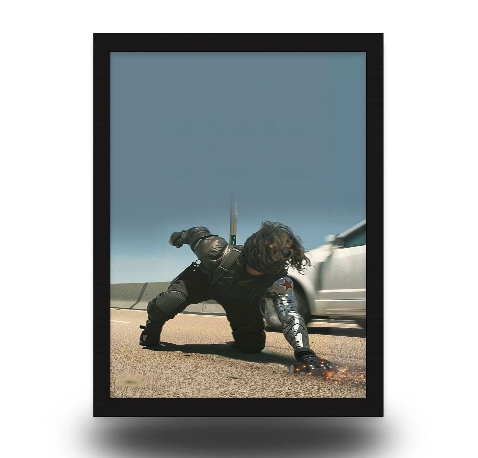 A dynamic capture of the Winter Soldier crashing onto the road, sparks flying from his metal arm. A must-have for Marvel fans who love raw action and intensity.